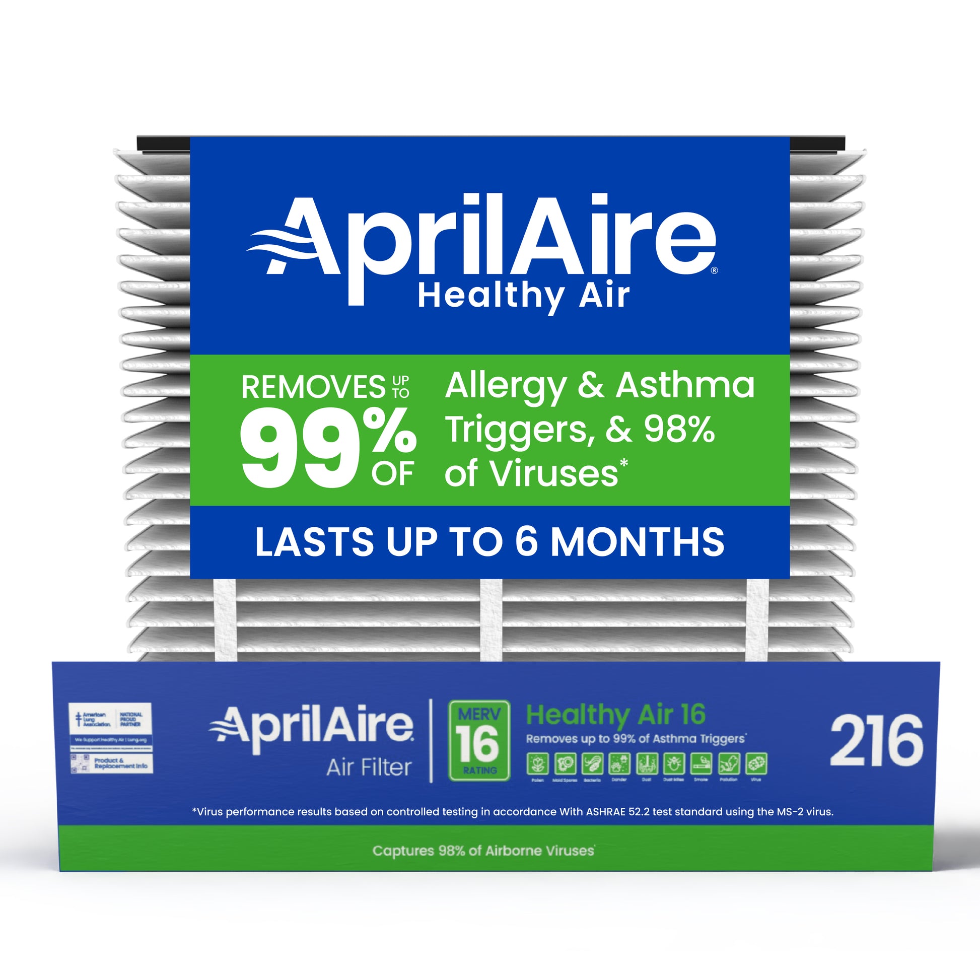 The air in your home has the potential to impact the health and wellness of you and your family. With the AprilAire 216 Healthy Air 16 Filter you have the power to use your whole-home air cleaner to remove allergy and asthma triggers from the air circulating through your HVAC system to help create a cleaner and healthier home environment during allergy season and all year long. The 216 filter captures up to 96% of virus-size airborne particles, tobacco smoke and smog, and up to 99% of airborne allergy and asthma triggers including airborne pollen, mold spores, bacteria, pet dander, dust particles, dust mites, smoke, pollution, and viruses as air circulates through the MERV 16 filter.